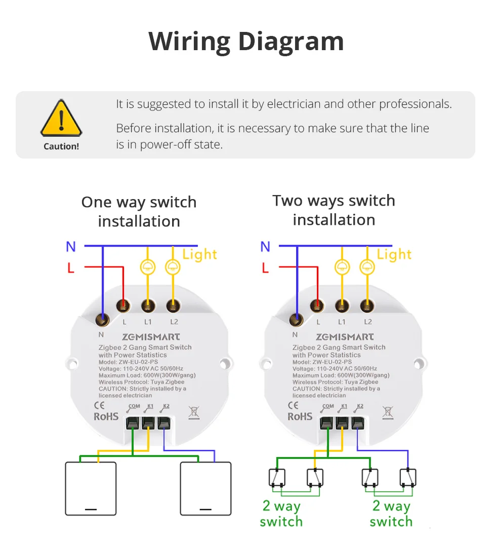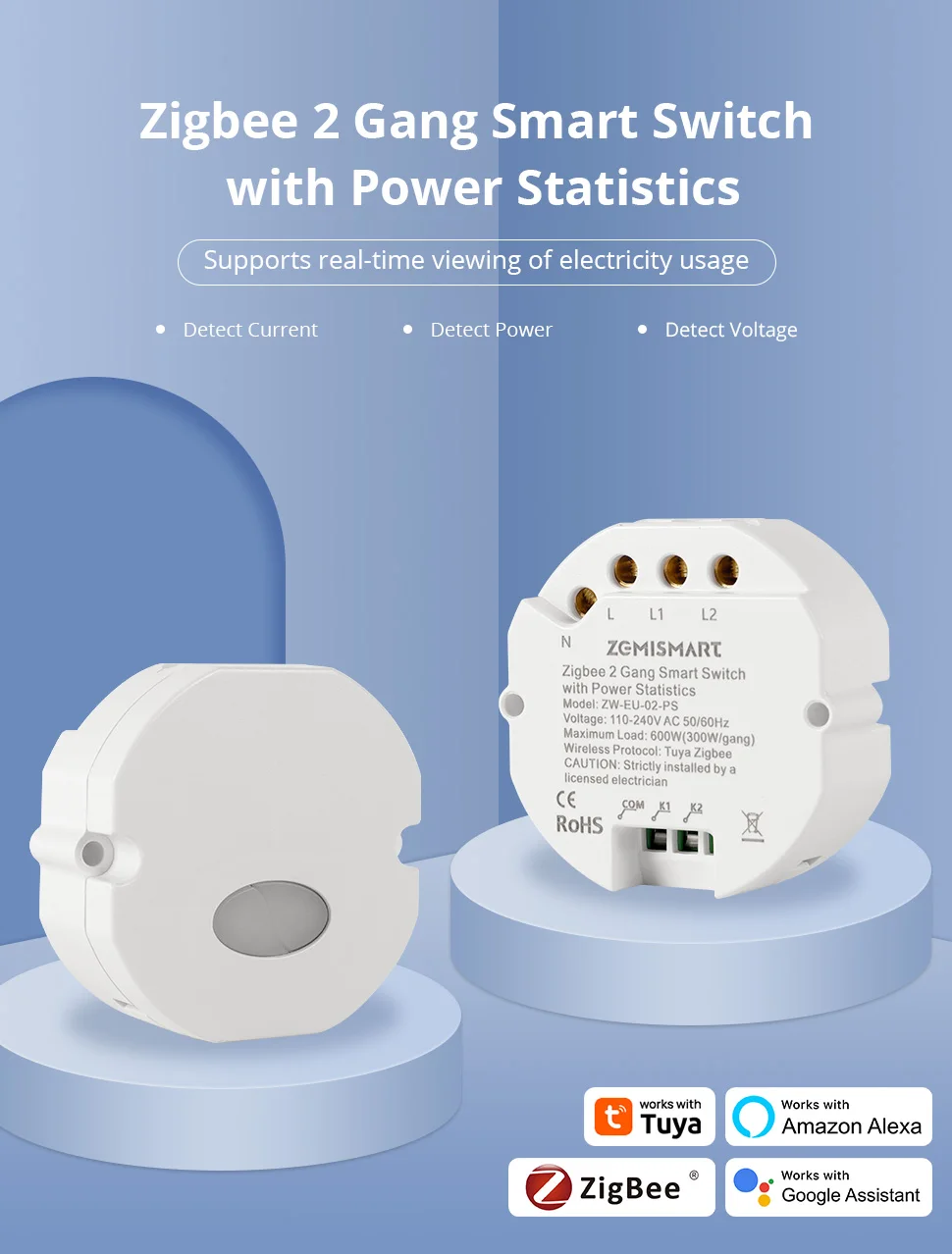 Zemismart Zigbee 2 Gang Smart Inline Module Mini Light Switch with Power Statistics Function Work with Tuya Smart Life App