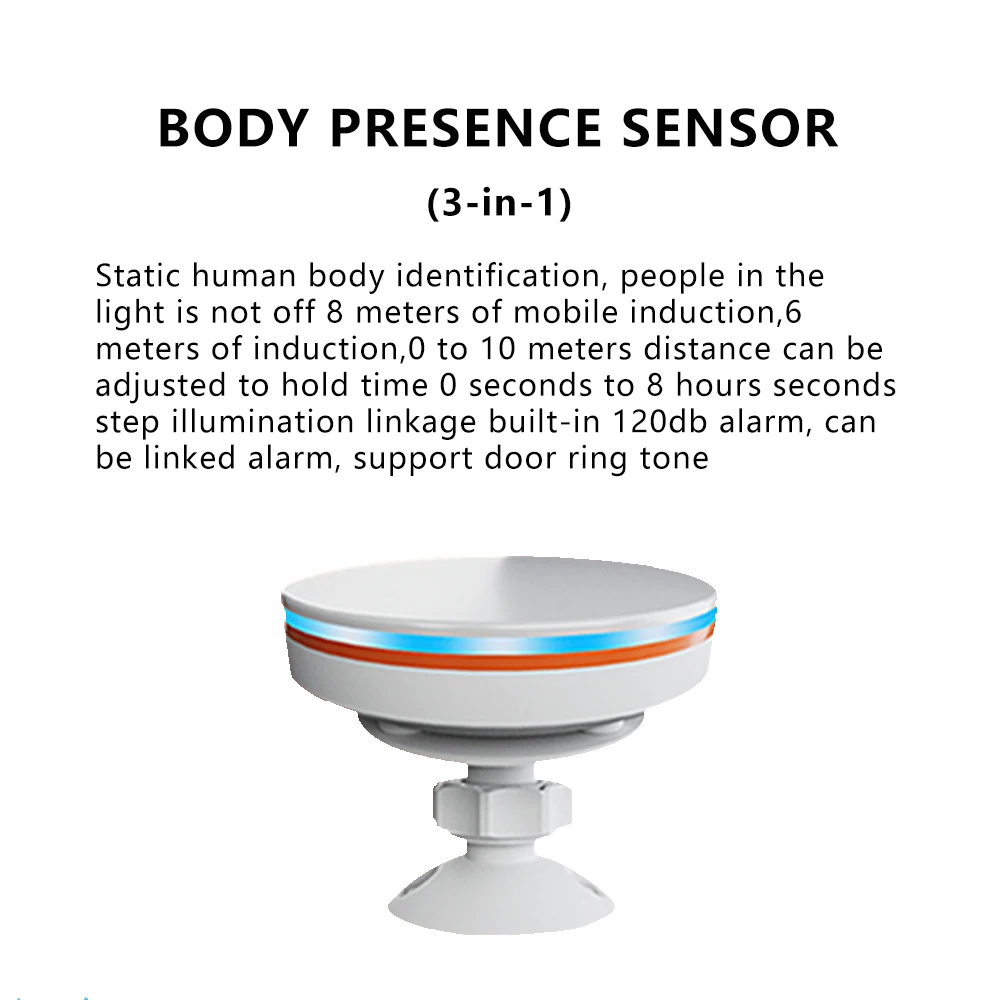 Features: 1.Built in tweeter 2.Security protection mode with alarm mode 3.High sensitivity detection, ultra-low false alarms 4.Multiple installation methods, paired with omnidirectional brackets, can be wall mounted and lifted 5.Millimeter wave human presence, built-in light sensing, sound and light alarm, and powerful three in one function