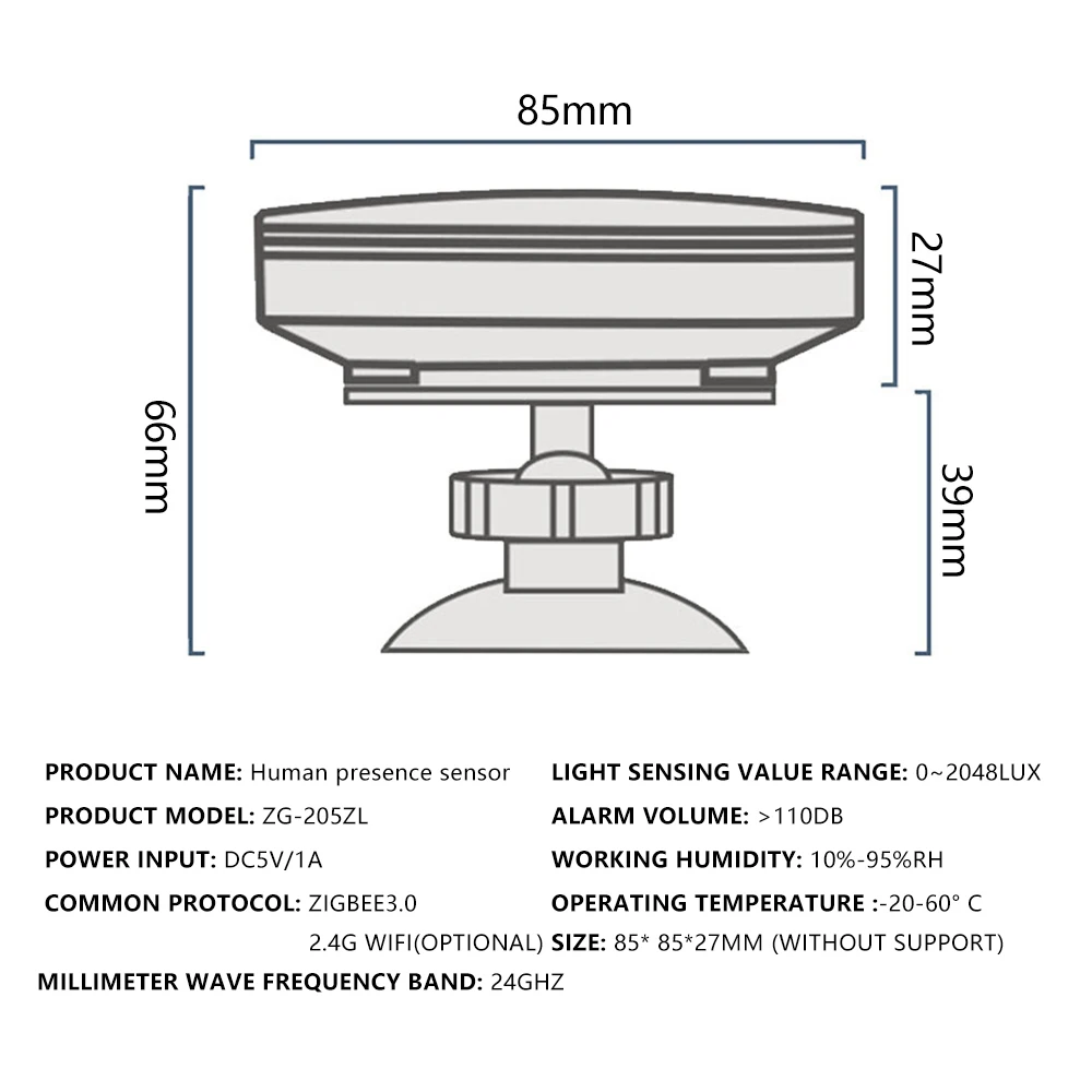Parameters: Product name: Human presence sensor Light sensitivity range: 0-2048Lux Product model: ZG-205ZL Alarm volume:>110dB Power input: DC5V/1A Working humidity: 10% -95% RH General protocol: Zigbee3.0 (gateway required) 2.4G WiFi (gateway not required) Working temperature: -20~60 ° C Size: 85 * 85 * 27mm (excluding bracket) Millimeter wave frequency band: 24GHZ